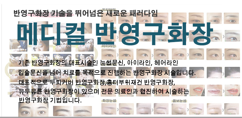 수술이나 사고로 인한 두피 또는 피부의 흉터를 별도의 절개수술없이 본인의 피부상태, 유형, 색상을 고려하여 자연스럽게 커버가 가능하며 백반증, 흉터, 심관혈관종, 문신, 화상 흔적등의 흉터를 커버하는 목적으로 사용되는 반영구 메이크업입니다.